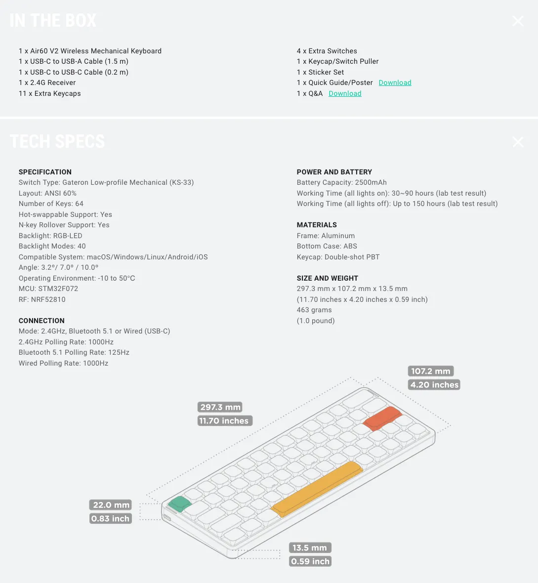 If you want wired, the Air60 has you covered, with USB-C. This added flexibility ensures that, regardless of preference, the keyboard is more than ready.