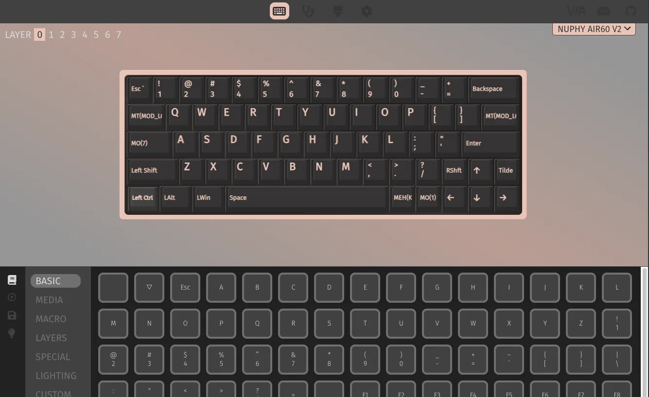 Personally, I'm a fan of using Caps + hjkl for arrows (yes, I'm a bit of a Vim nerd 🤓). While Nuphy doesn't come with those binds by default, the QMK firmware allows you to remap every single key on the board. In my case, activating another layer with Caps provides hjkl as the arrow keys.