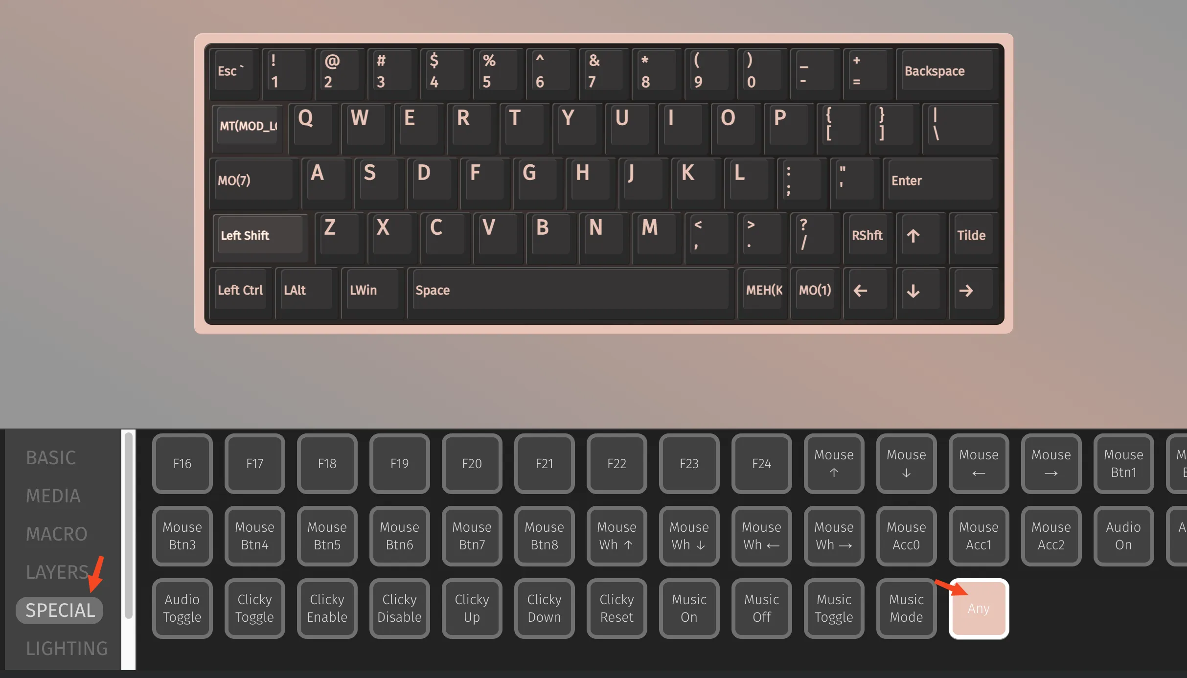 For the Caps key I have it setup slightly differently. This key activates layer 7 via MO(7).